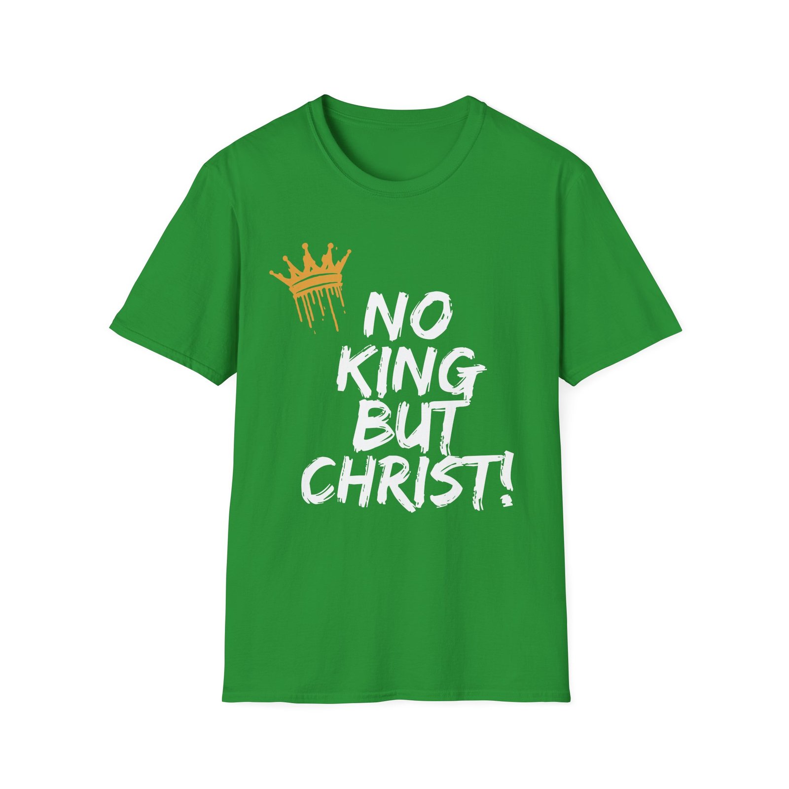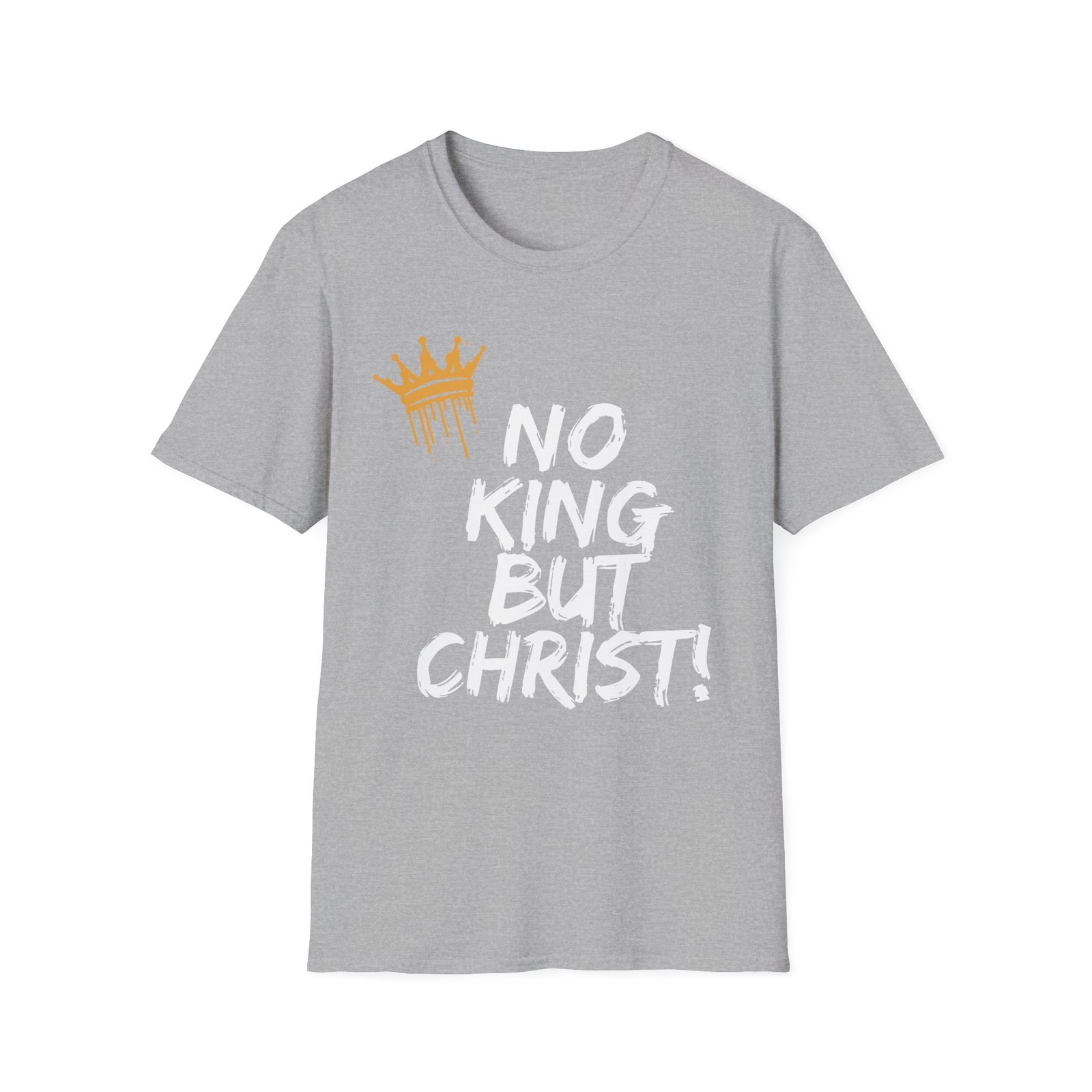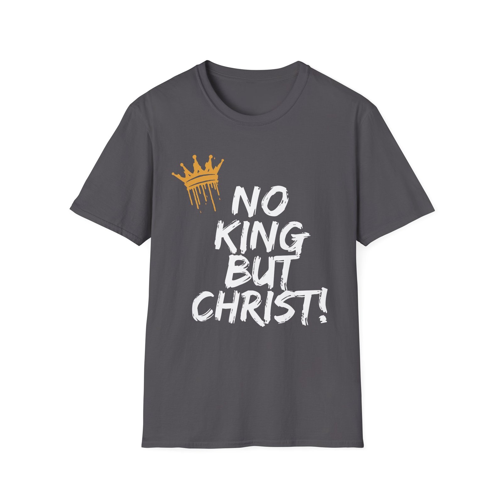 This lightweight crewneck tee speaks with quiet conviction. Bold, hand-painted lettering declares faith—”No King But Christ!”—while a distressed gold crown drips like freshly applied paint. Wear it to church small groups, outreach nights, or everyday moments when your testimony needs to be simple and strong. The soft cotton feels broken-in from the first wear. It sits clean at the shoulders and hangs relaxed through the body, letting the message take center stage without shouting. For believers who prefer honest style over flashy statements, this shirt folds easily into weekend outfits, layered looks, or mission trip packs.