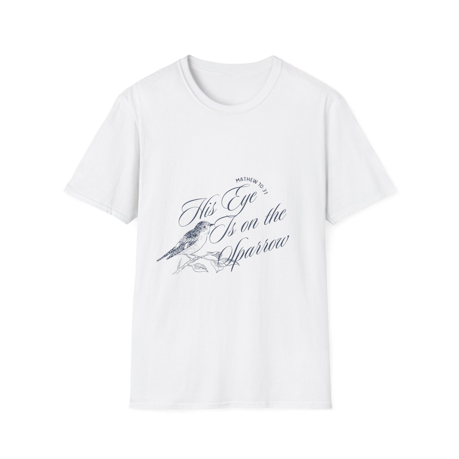 This lightweight tee brings quiet poetry to everyday wear. A delicate sparrow sketch and flowing hand-lettered line — “His Eye is on the Sparrow” — sit gently across the chest, offering a calm, reflective presence without shouting. The soft ring-spun cotton drapes easily and breathes through warm days, so it becomes a go-to layering piece for chapel Sundays, morning walks, or slow coffee hours. Subtle and reverent, it complements simple jeans, cardigans, or a favorite jacket, and reads like a personal reminder more than a statement. The neutral print tones and classic crew cut let the message sit naturally with the rest of your wardrobe, inviting quiet comfort and steady faith to everyday moments.